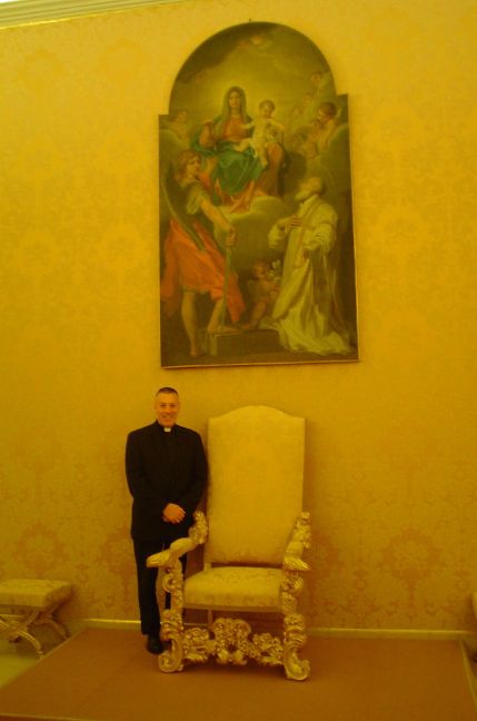 Fr. Jerry Baker next to the papal chair. |