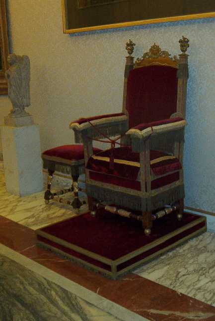 A smaller meeting room with papal chair next to a statue of St. Peter which dates from the 4th century St. Peter's Basilica of Constantine. |
