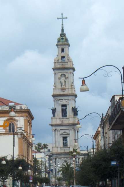 Arriving at the train station in "New Pompeii", one cannot miss the 5 story belltower of the Basilica of Our Lady of the Rosary. |