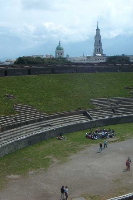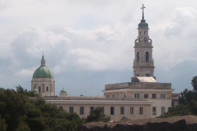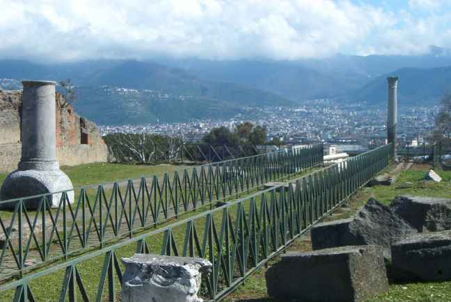 A view of the modern city of new Pompeii, and a reminder that Mount Vesuvius still lurks it the background (it last erupted in 1944). |