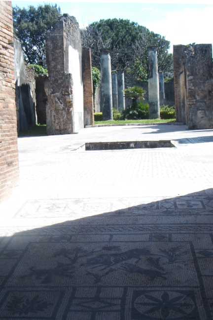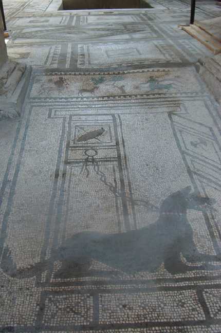 The mosaic at the entrance of this house shows a wild boar being attacked by two dogs. Also not the large portico with a garden. |