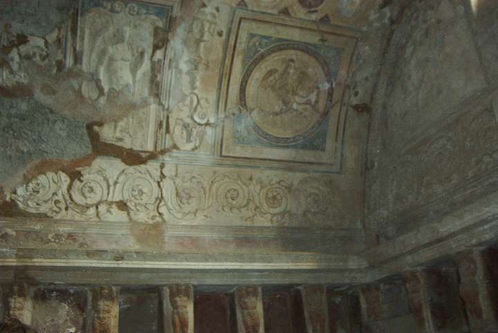 Inside the Forum baths, this is the "tepidarium", a room between the hot and cold baths. It has a stucco barrel vault ceiling, and niches in the walls adorned with terra cotta. |