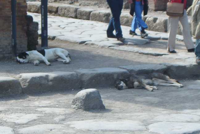 Let a sleeping dog lie. Look how perfectly preserved these ancient Roman dogs are, looking for a nap in the shade. Plus its a good example of what the streets looked like - all original. |