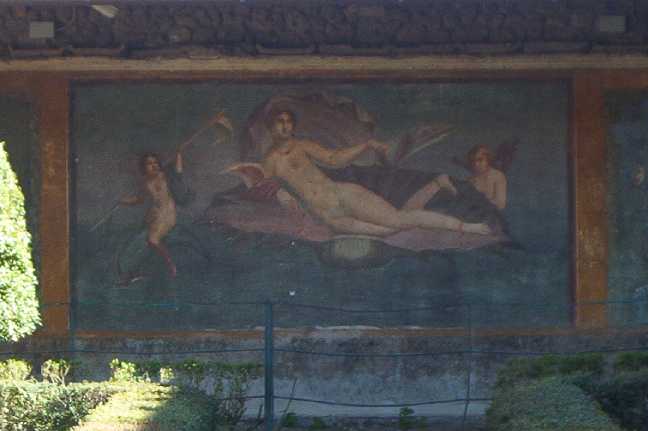 A monumental mural painting of Venus, on a seashell escorted by cupids. Well preserved, it was discovered in 1952. |