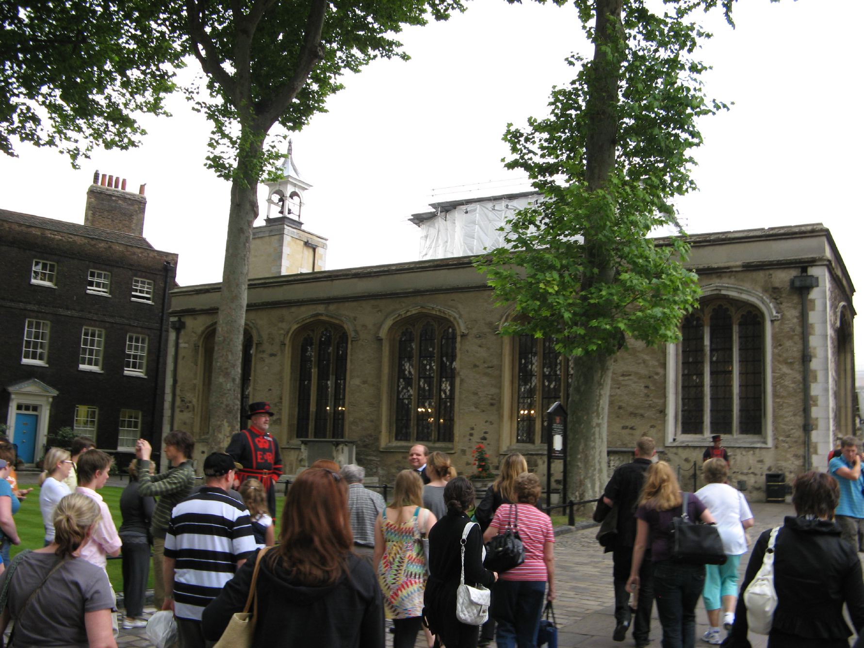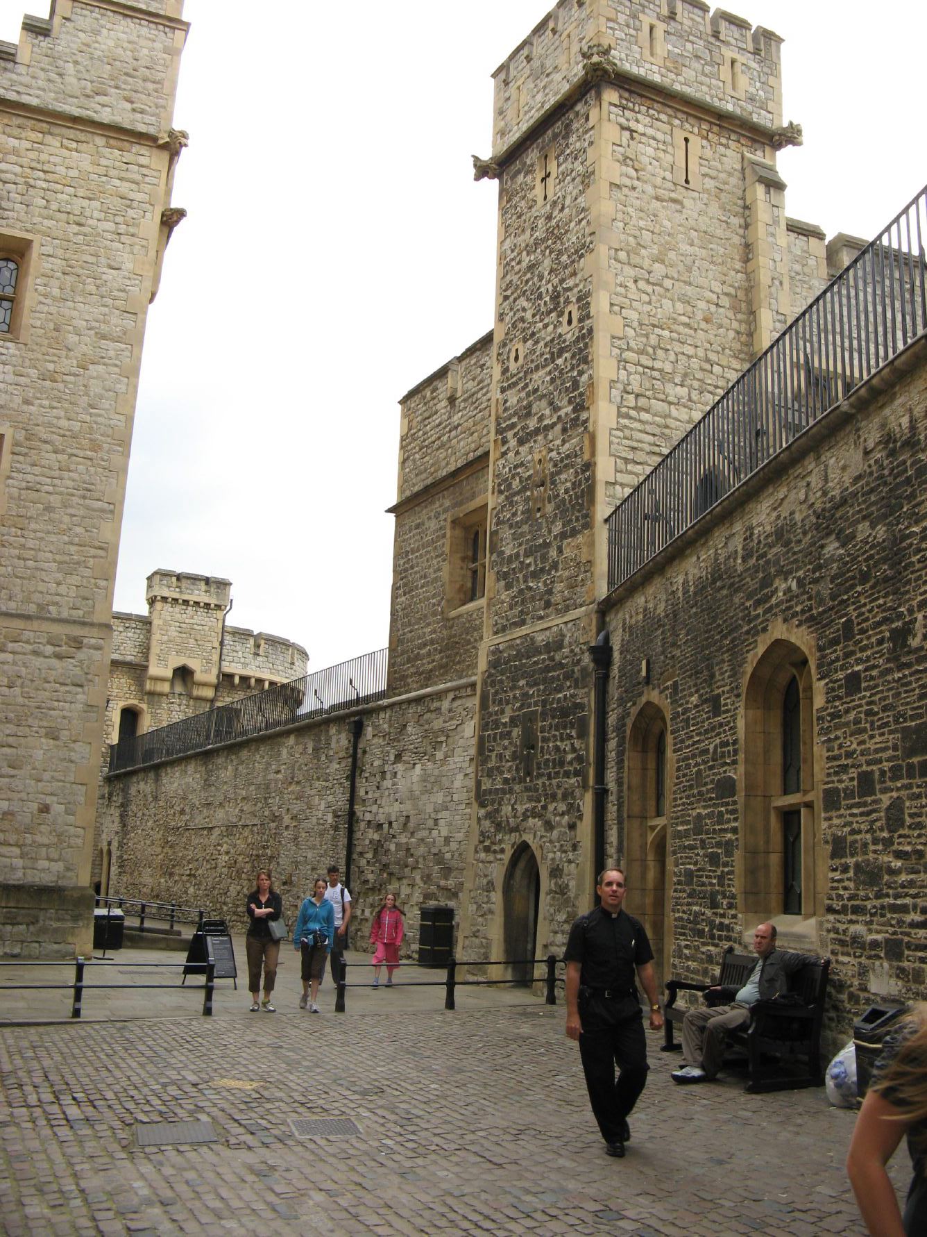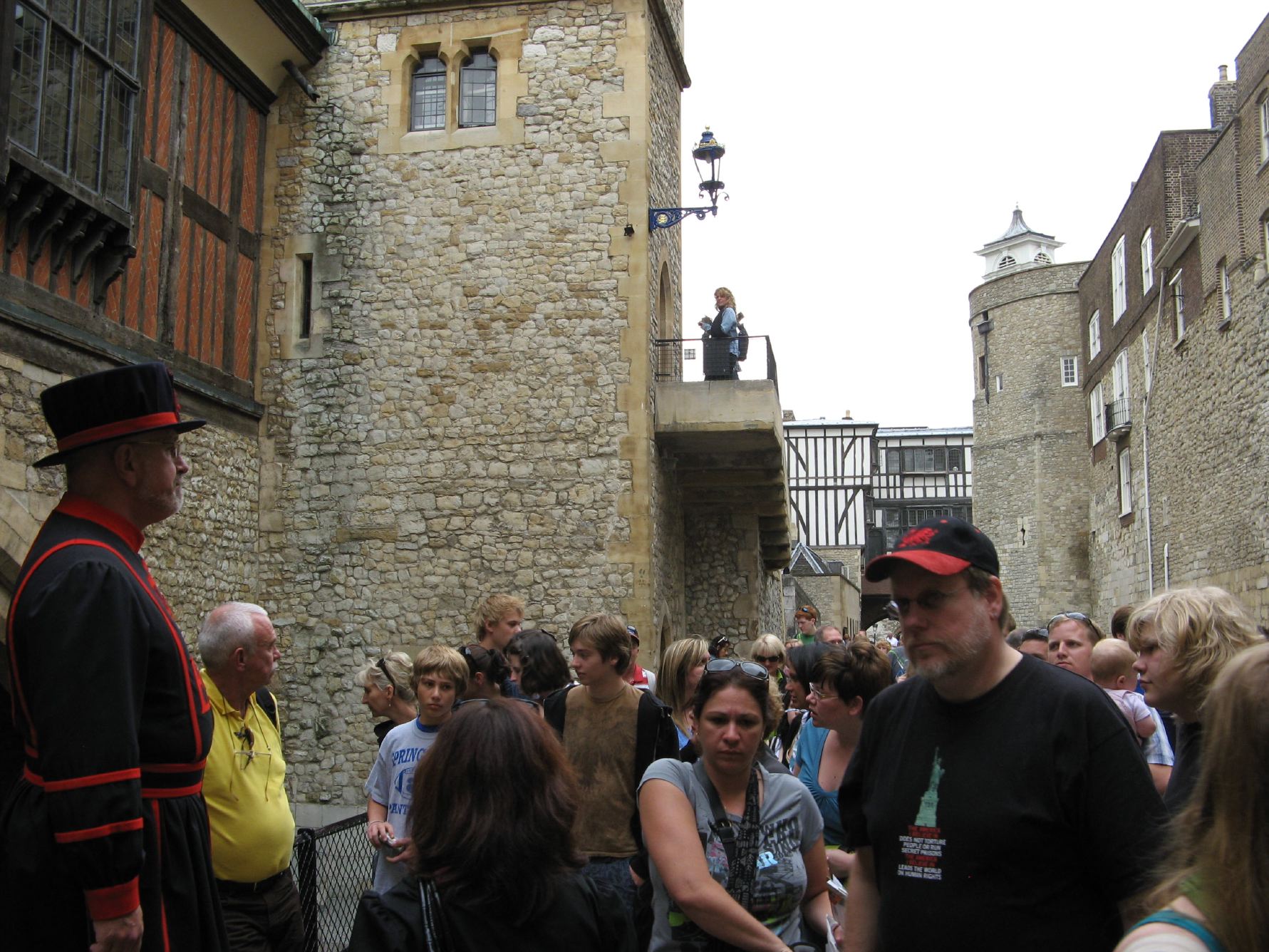On the Beefeater tour. The round tower on the right is the bell tower where Thomas More was held. |