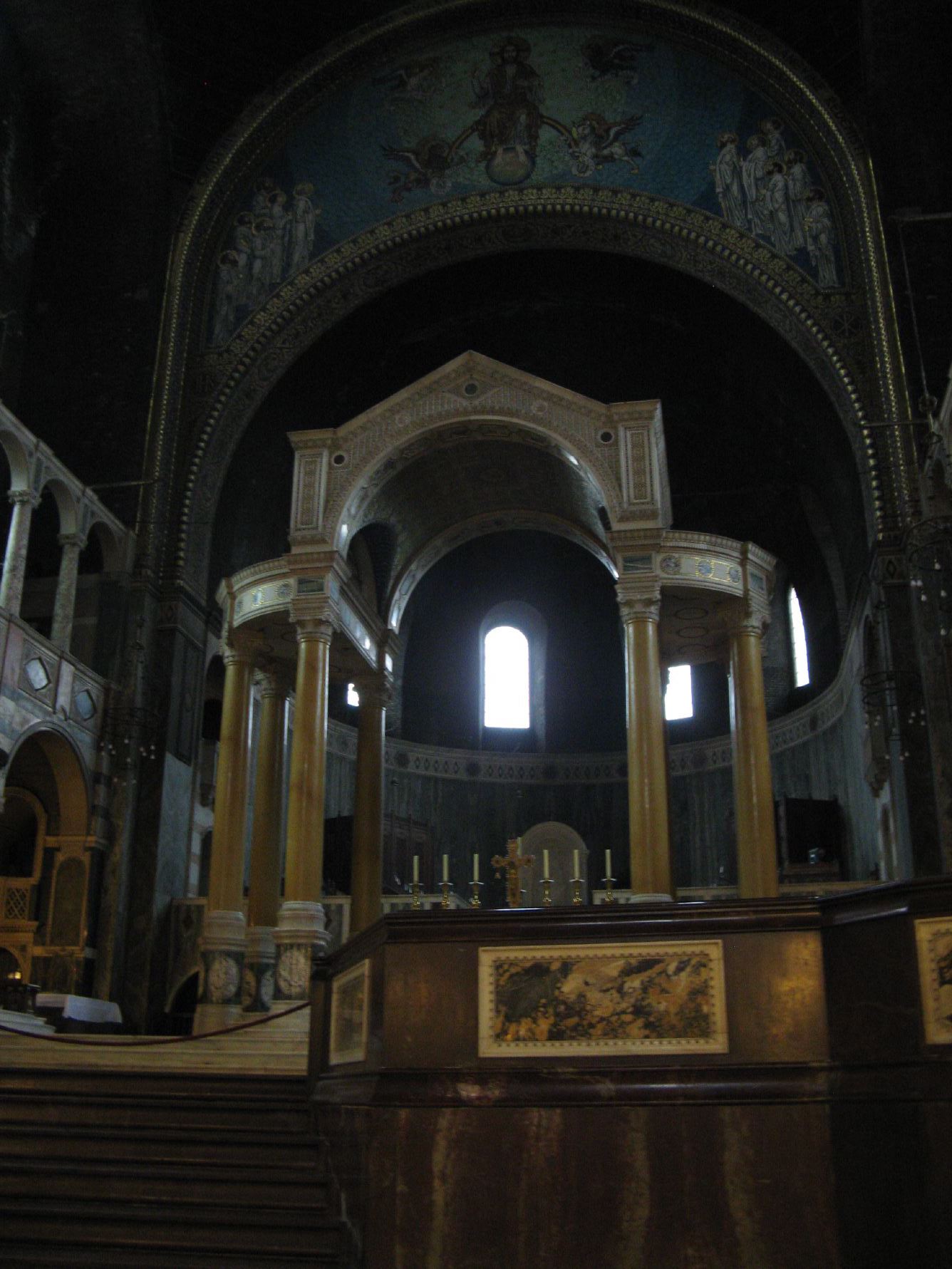Sanctuary of the Cathedral, note the baldicino over the altar and mosaics above. |
