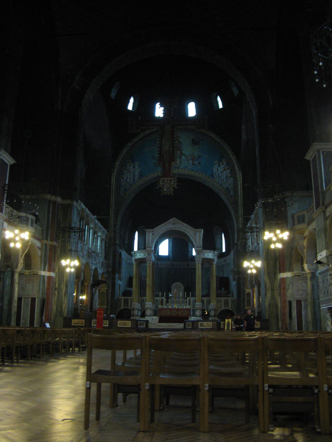 Interior view of the Cathedral, built in 1903, with massive crucifix. |