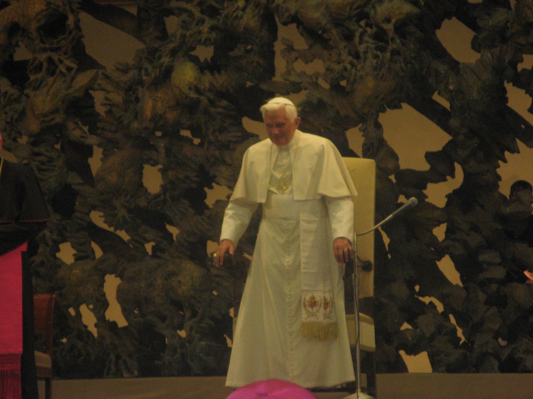 The Pope arrives at the chair and gives me his greetings.