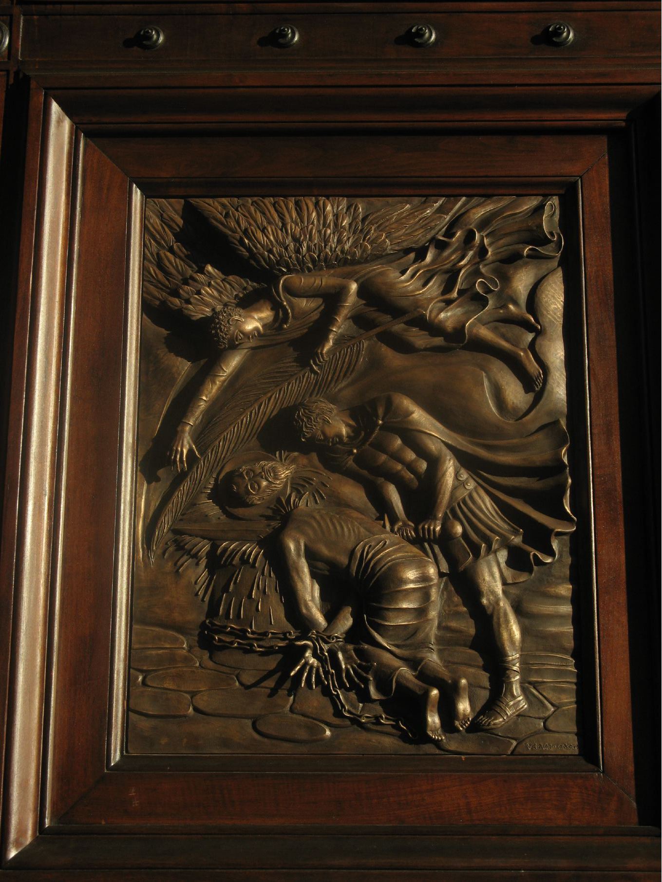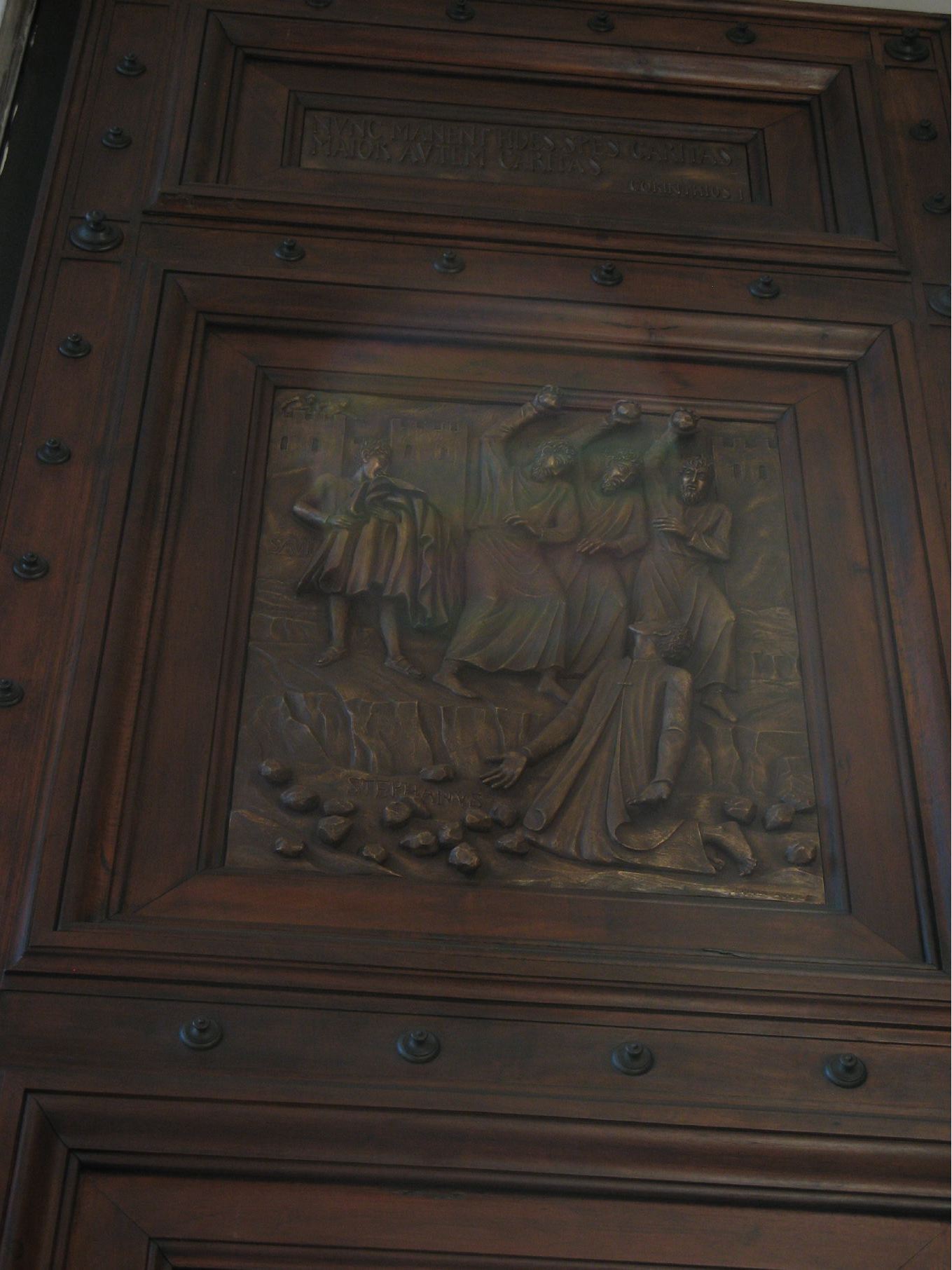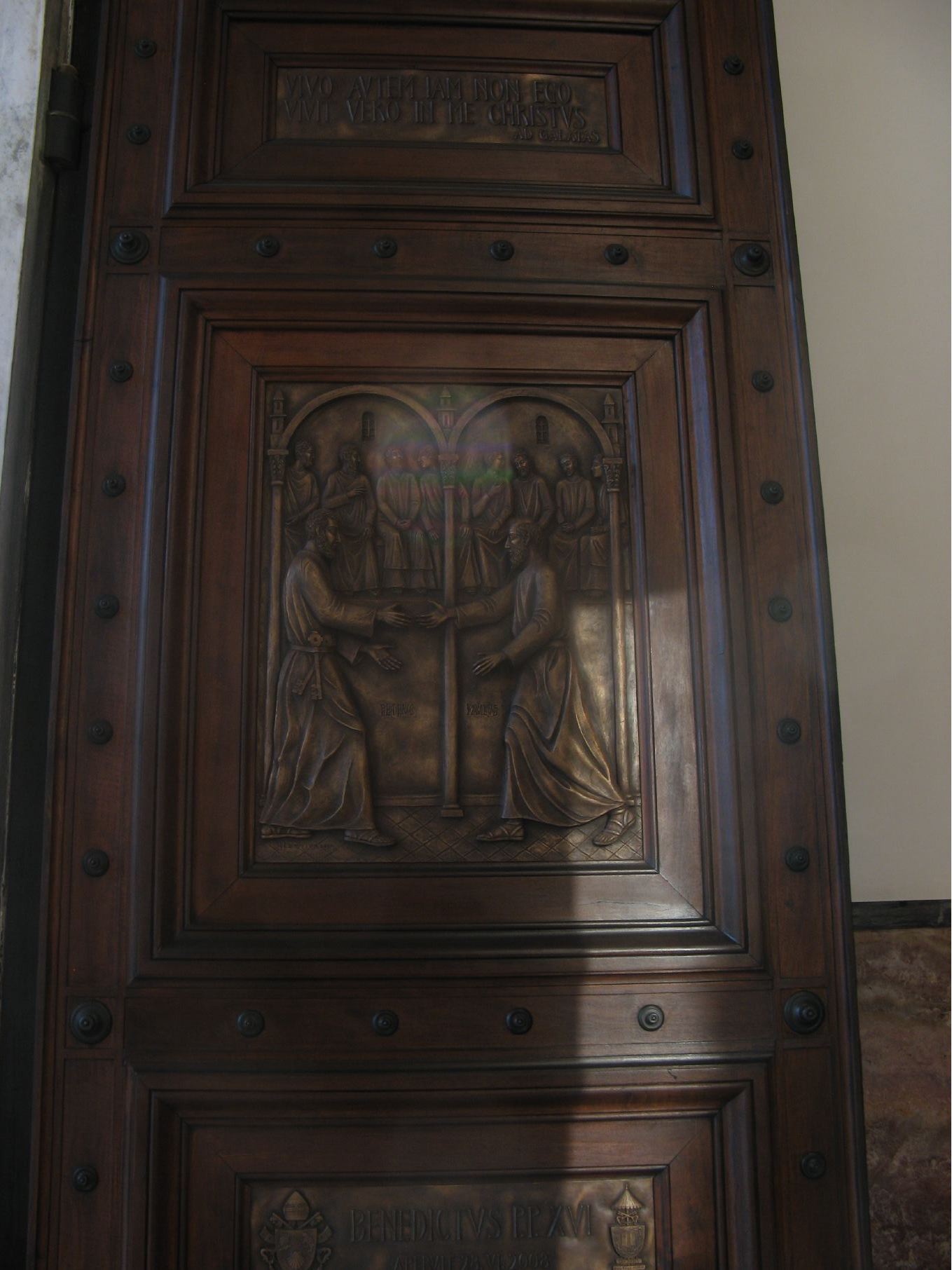 The door has various bronze panels - here the handclasp of friendship with the other apostles. |