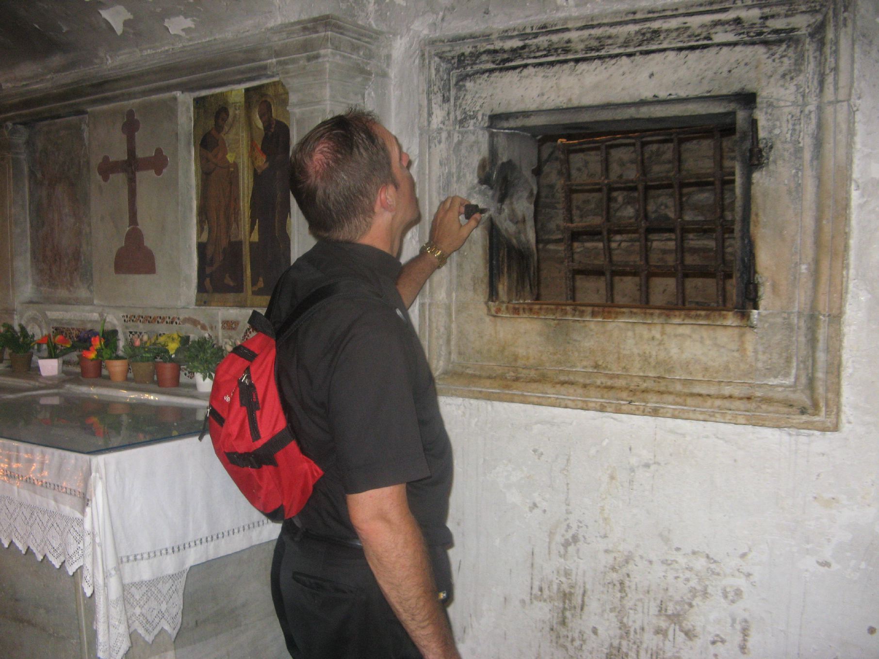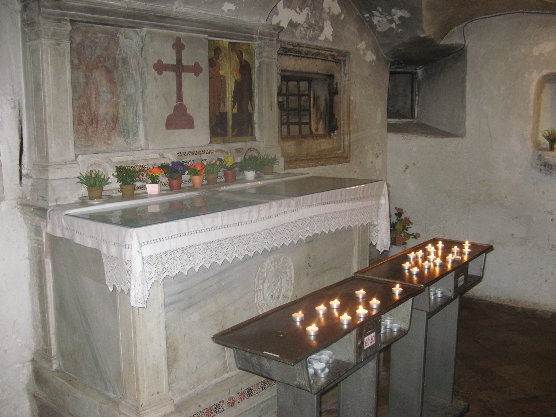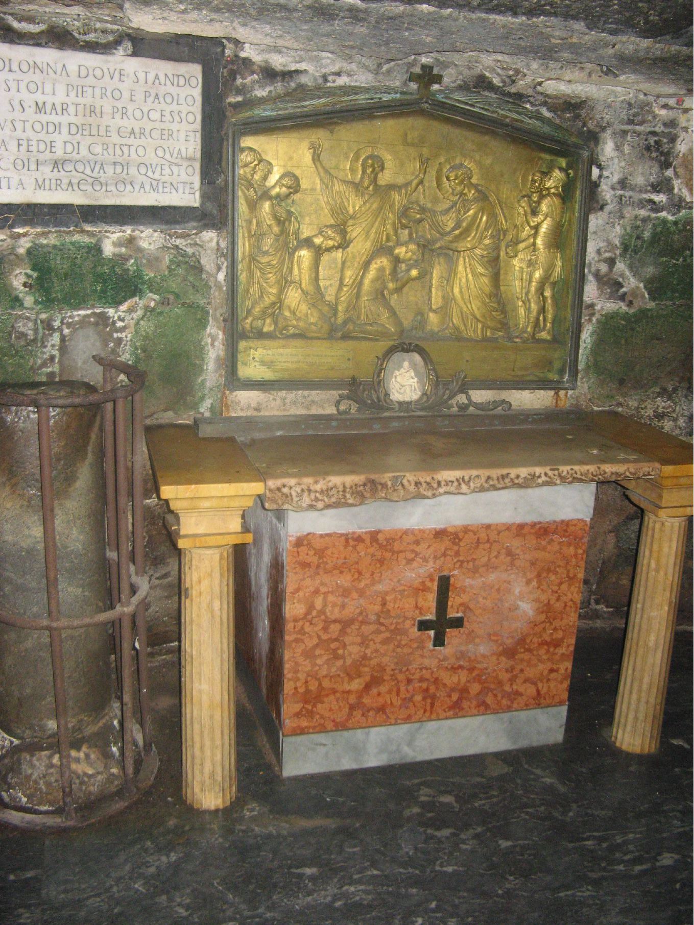 Cell inside the prison, with the column on the left which the saints were bound to. The image above the altar is St. Peter baptizing his jailer. |