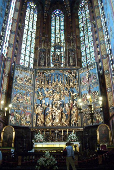 High altar of St. Marys, a massive 15th century wood carving of huge proportions. The main scene is the Dormition of the Virgin, as the figures of the apostles support the fainting Mary. |