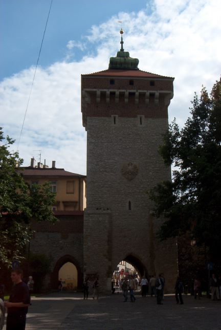 St. Florian's Gate, the official entrance to the city through which royalty would enter (and invaders). The tower was constructed in 1300, from which a heavy gate was lowered to protect the city. |