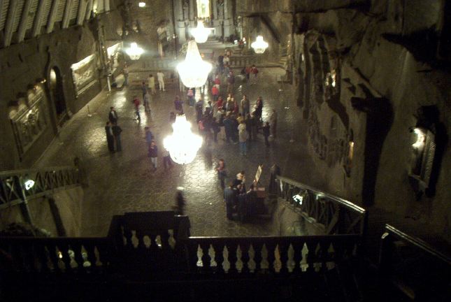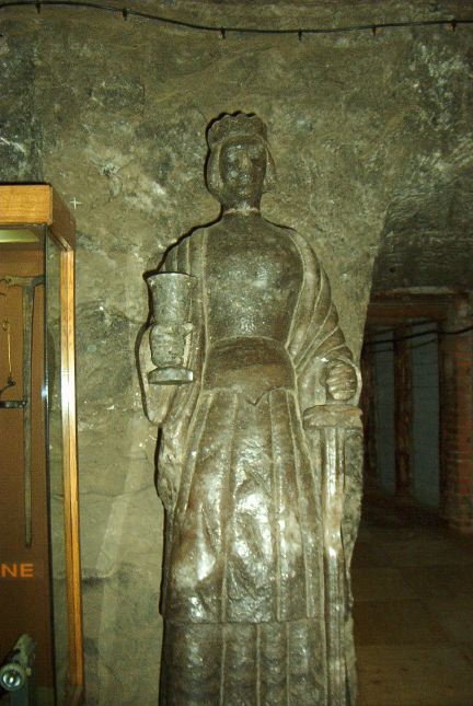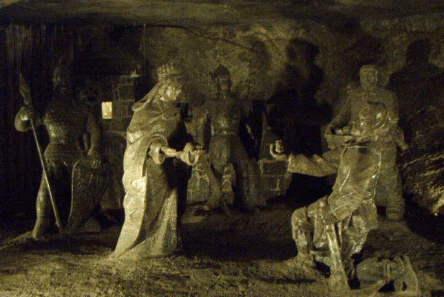 Legend says this salt mine was part of the dowry of the Hungarian princess Kinga when she married the Polish King Boleslaw the Shy. This image recalls the myth that an engagement ring was found among the salt. |