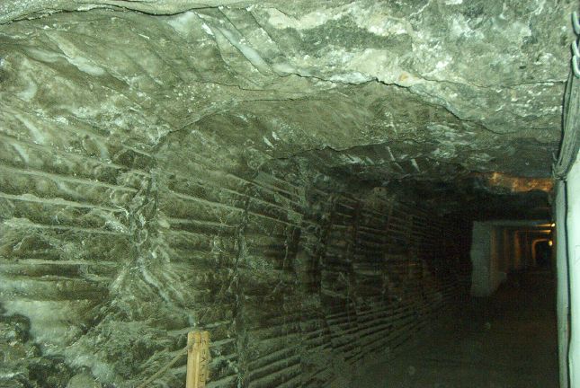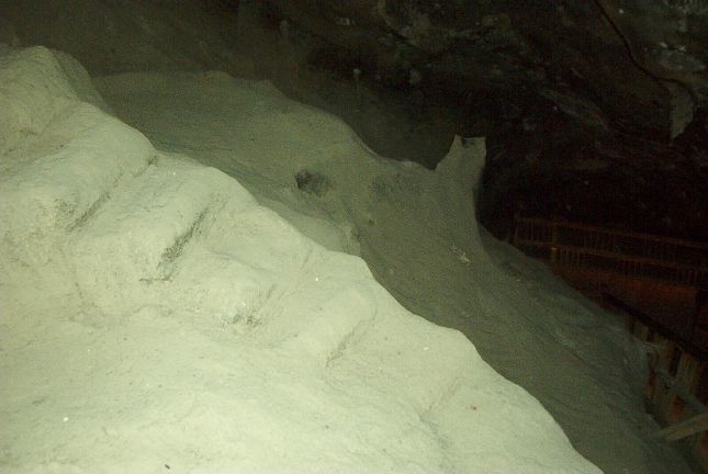 Looking down from the first to the second level, one sees the old steps which the miners had carved in the salt. |