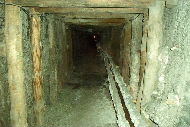 This passageway also shows a pipe / trough for removing water - one of the continual problems for the miners. The mine was almost destroyed by flooding in the 1970s. |