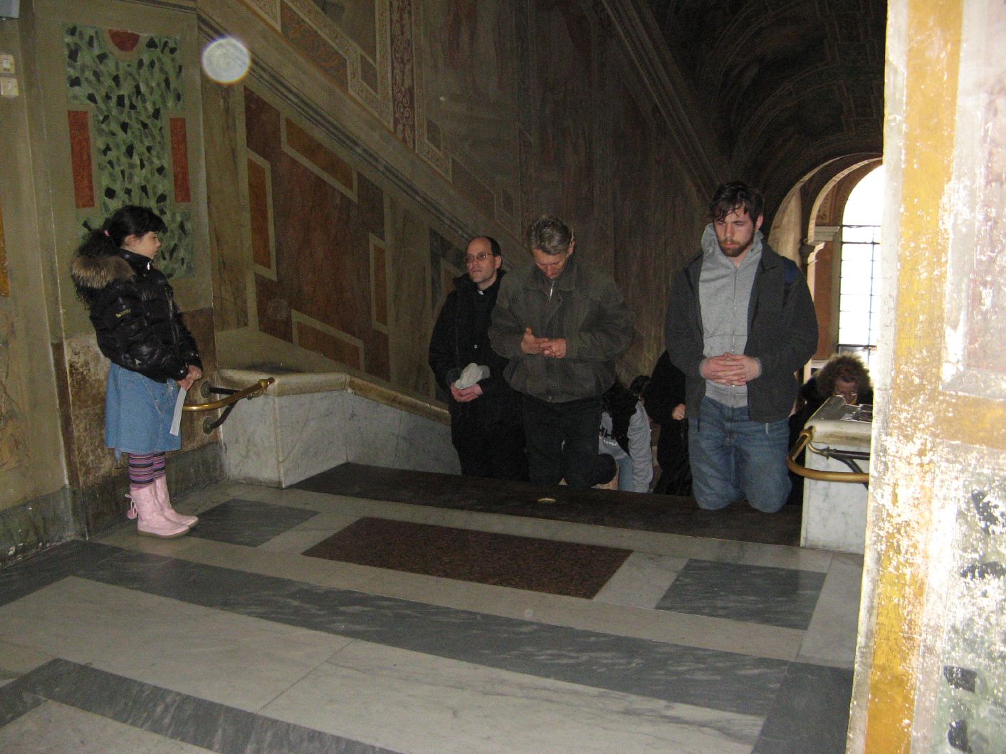 Climbing the Holy Stairs, which Jesus stood on outside of Pilate's residence in Jerusalm. (And St Helena moved them to Rome.) |
