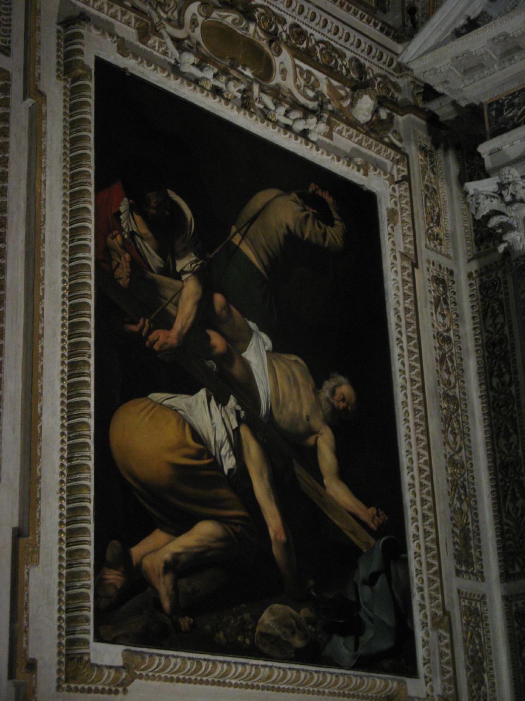 Inside Santa Maria del Populo, the Crucifixion of St. Peter by Caravaggio (1601). |