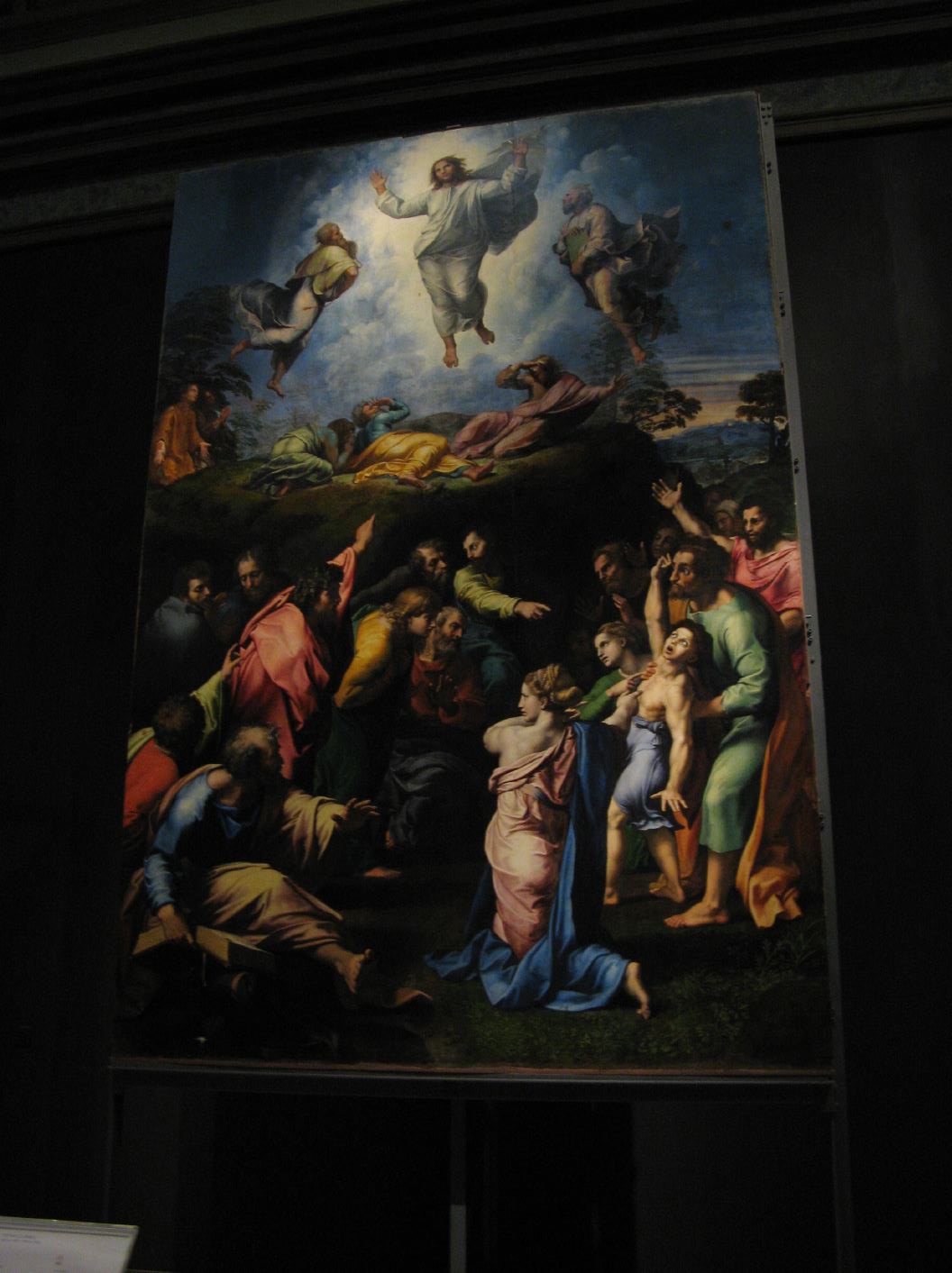 The Transfiguration (1516-1520) was Raphael's last painting. Besides the Transfiguration above, with Christ in glory between the prophets Moses and Elijah, below in the foreground, is the meeting of the Apostles with the obsessed youth who will be miraculously cured by Christ on his return from Mount Tabor. |