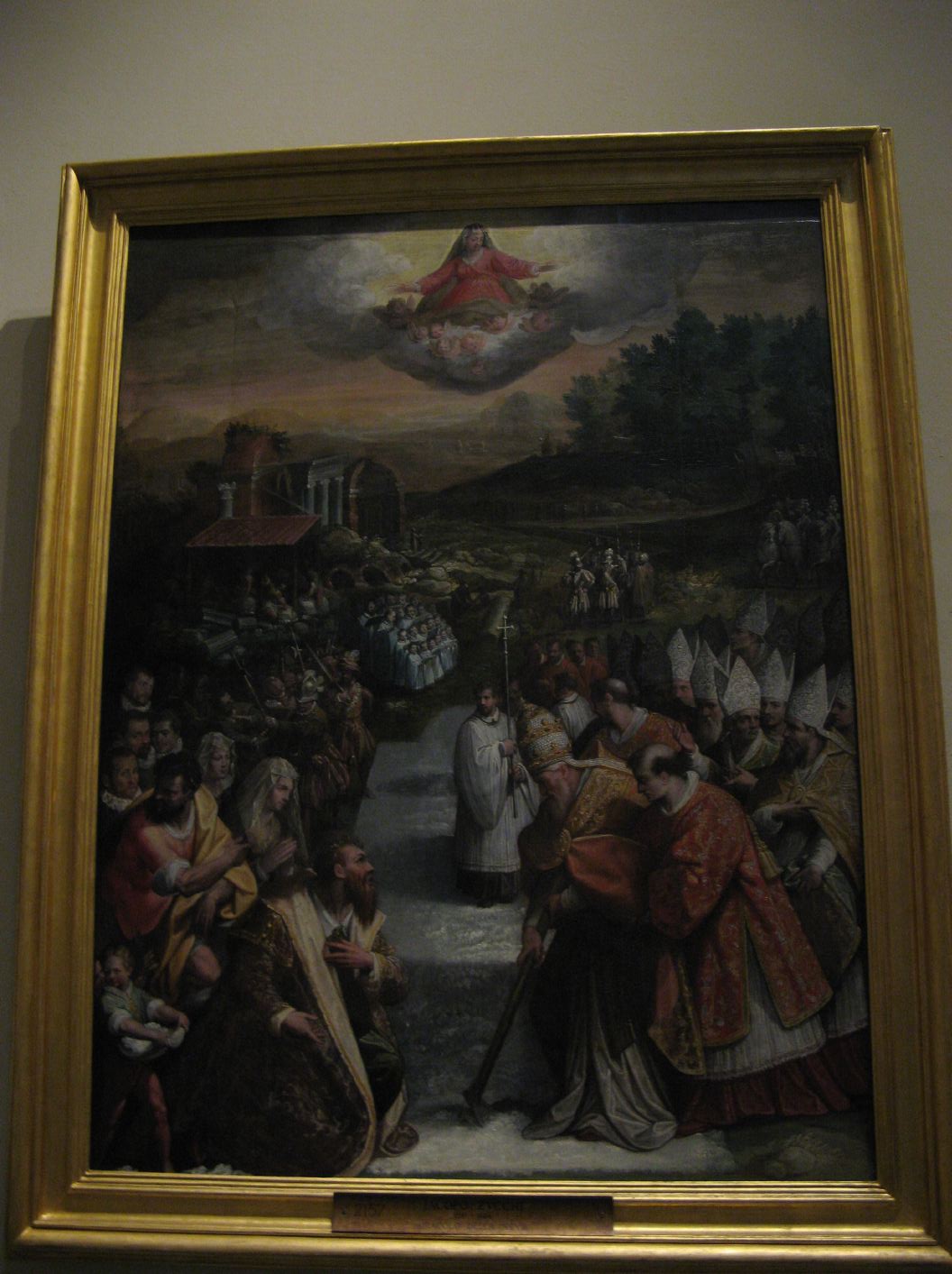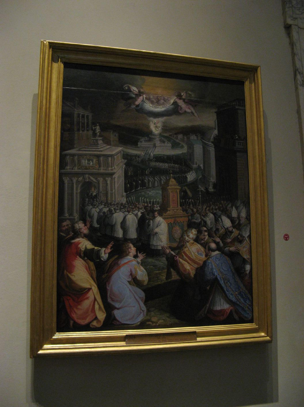 Jacopo Zucchi, Procession of St Gregory the Great. Depicts how in 590 Pope Gregory the Great, conducting a penitential procession to pray for the end of a plague, had a vision of the archangel Michael sheathing his sword over the castle, signifying the end of the plague. |